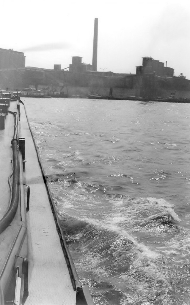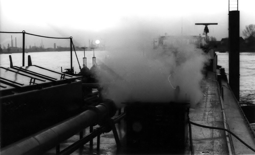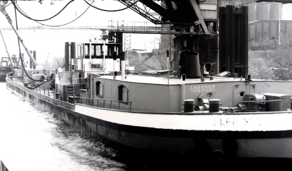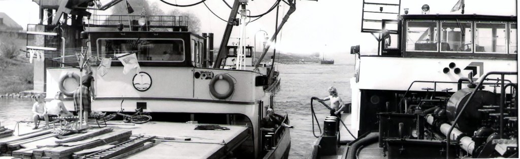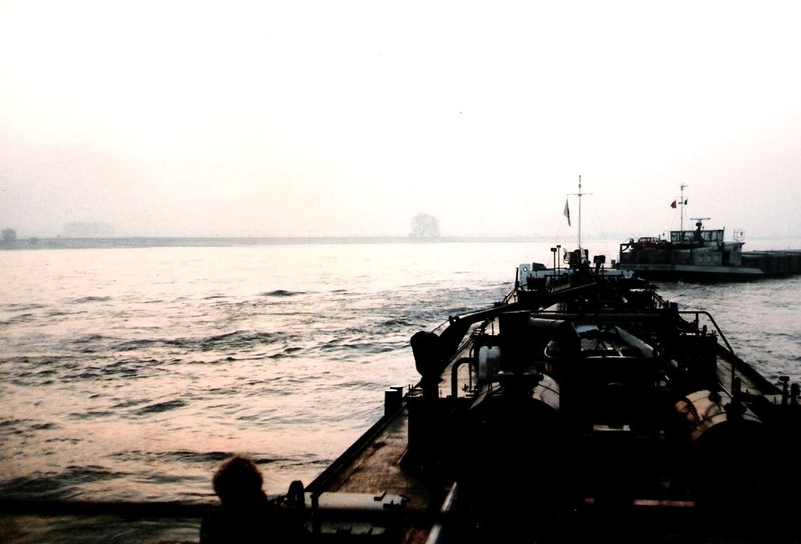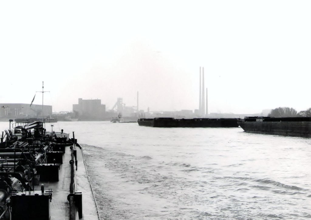 We lopen de Franz Haniel 8 (ex Janus) van onze Duitse zustermaatschappij Elbe op, terwijl rechts daarachter de Carl Straat zichtbaar is — bij Rijnvaarders beter bekend als “de grote grijze keienvreter van de Rijn”.