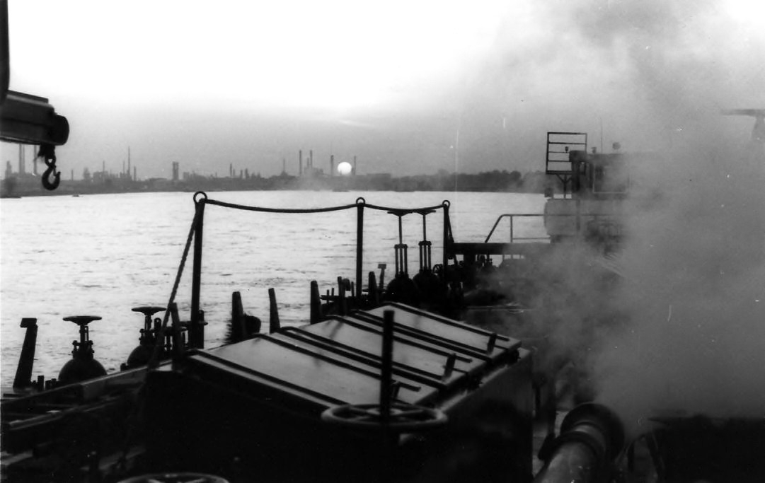 Op donderdag 23 april 1987 was het weer vroeg reveille, maar de mooie zonsopkomst en een paar stevige bakken koffie maakten dat bepaald geen straf. Die ochtend werd het laatste stuk stroomopwaarts afgelegd met onze lading bietmelasse. We varen o.a. langs de Bayer‑vestiging in Dormagen.