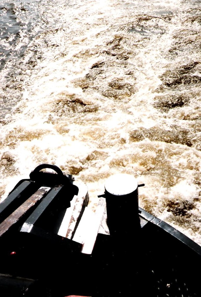 Ons schroefwater verraadt behoorlijk wat kracht, maar onze 600 pk valt toch in het niet bij de 6000 pk waarmee de Franse duwboot Albert Auberger (nu Herkules II, ENI 01820014) zijn vier geladen bakken voortstuwt.