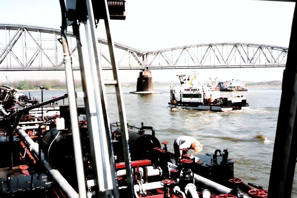 Hij verkijkt zich op de stroming en loopt met volle vaart vast op de bodem bij de ingang van het grindgat. Op de foto is te zien hoe hij al bezig is de duwbak los te krijgen door achteruit te slaan. Daar is hij nog geruime tijd druk mee geweest!