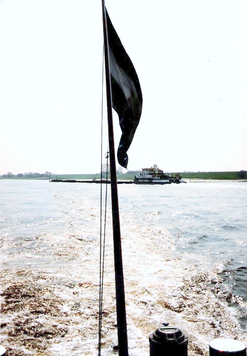 Stoer, met volle kracht vooruit, steekt hij de Rijn over met een kleine geladen duwbak voor de boeg, om daarna het grindgat van de Rijn bij km 810, net boven Wesel, in te varen.