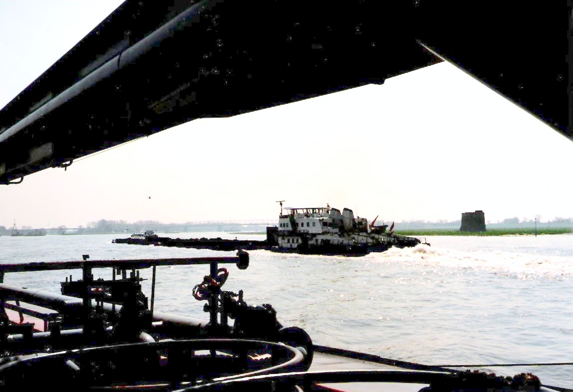 Er zijn die ochtend, vlak na de Paasdagen, meer schepen met lading naar het achterland vertrokken. We worden al snel ingehaald door een tanker en een drogeladingschip, waarvoor de Alvracht 11 even vaart mindert, omdat deze schepen anders door de zuiging van onze waterverplaatsing bij ons zouden blijven hangen.