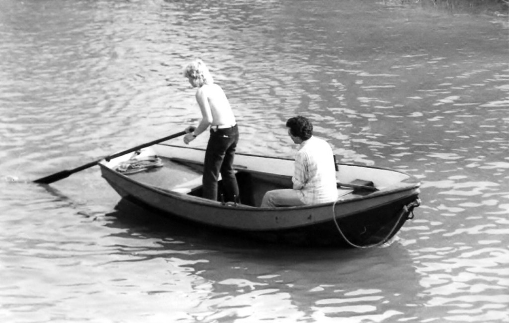 Terwijl Gerhard het achterschip vastmaakt, stappen Jos en Jan in de roeiboot. De vrachtpapieren moeten worden afgegeven op het kantoor van de Unifern‑fabriek. Jos wrikt de boot behendig naar de kant, terwijl Jan intussen foto’s maakt.