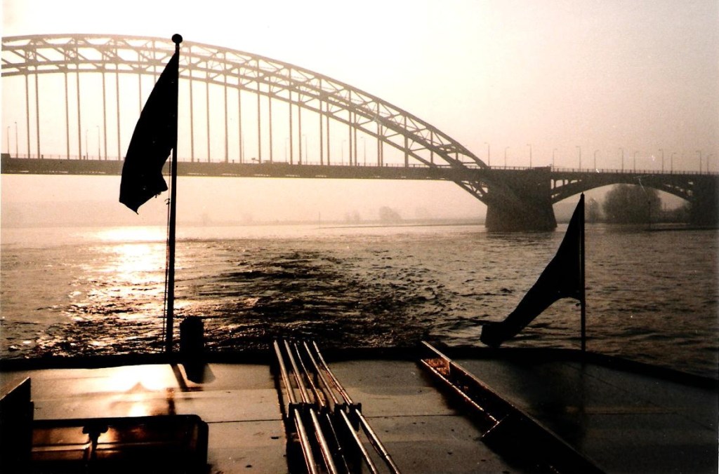 Stemmige vroege ochtendsfeer ter hoogte van Nijmegen. Rechts nog een andere vlag: de groene vlag is erbij gezet, hetgeen vrije doorvaart bij de douane waarborgt.
