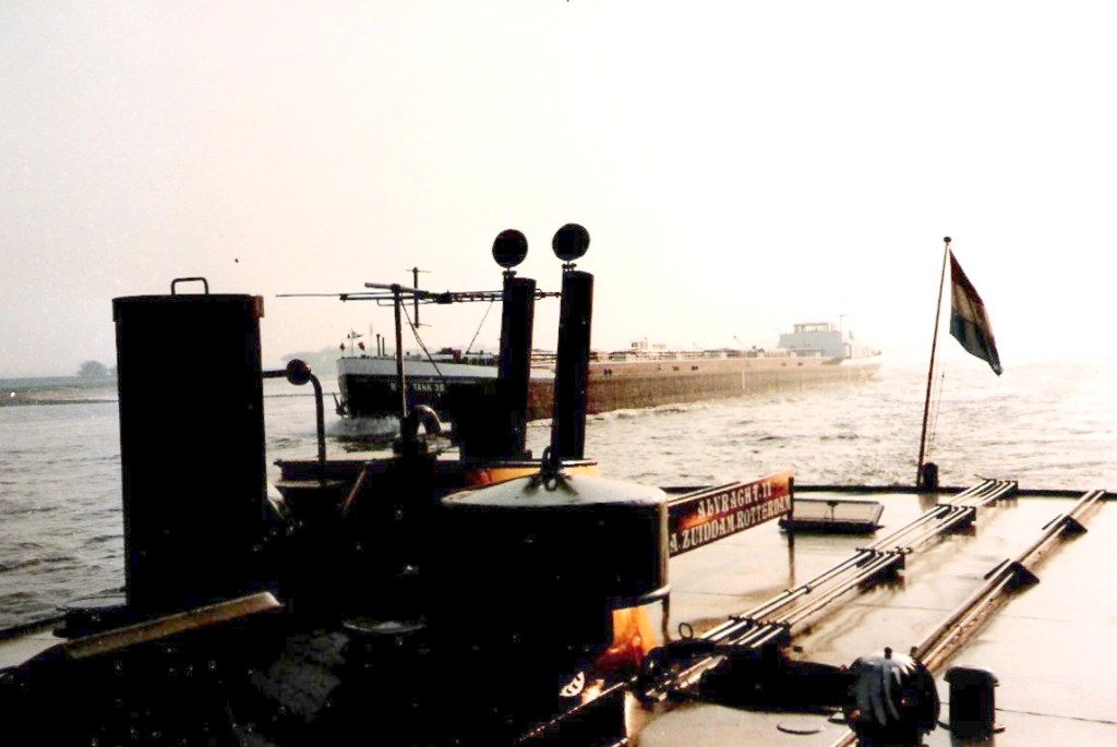We hebben de Stinnes‑Schub I bijna ingehaald… Maar doordat we door de drukte in zijn volle schroefwater terechtkomen én tegelijkertijd de zuiging van het tank‑koppelverband Esperatank 4 – Oran ondervinden, verliezen we weer duidelijk terrein.