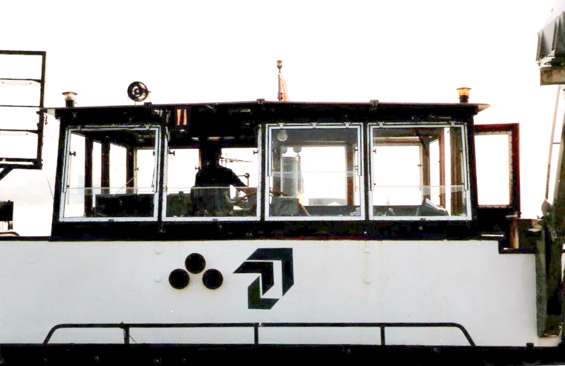Zicht vanaf de achterzijde van de stuurhut. Links door de ramen is de Stinnes‑Schub I te zien, nu dichterbij dan toen we langs de lege duwbakken voeren.