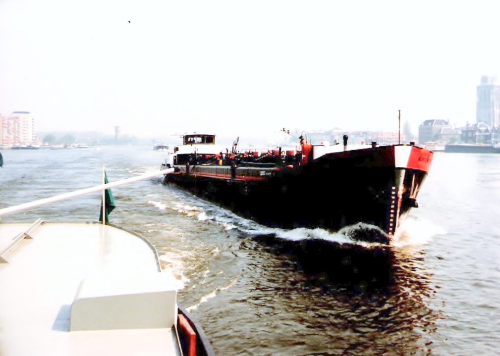 De tanker Jan Bart, evenals de Alvracht 11 een voormalige Shell‑tanker, heeft ons zojuist bij km 768 ingehaald.