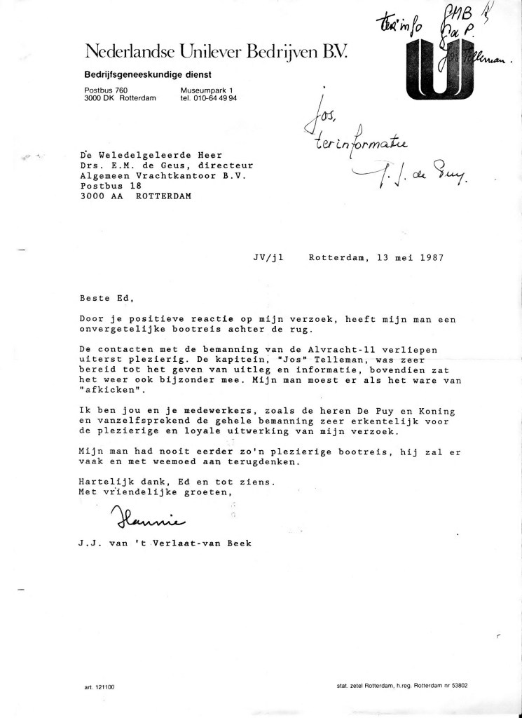 Bedankbrief van Jan z’n echtgenote aan de toenmalige directeur Ed de Geus.