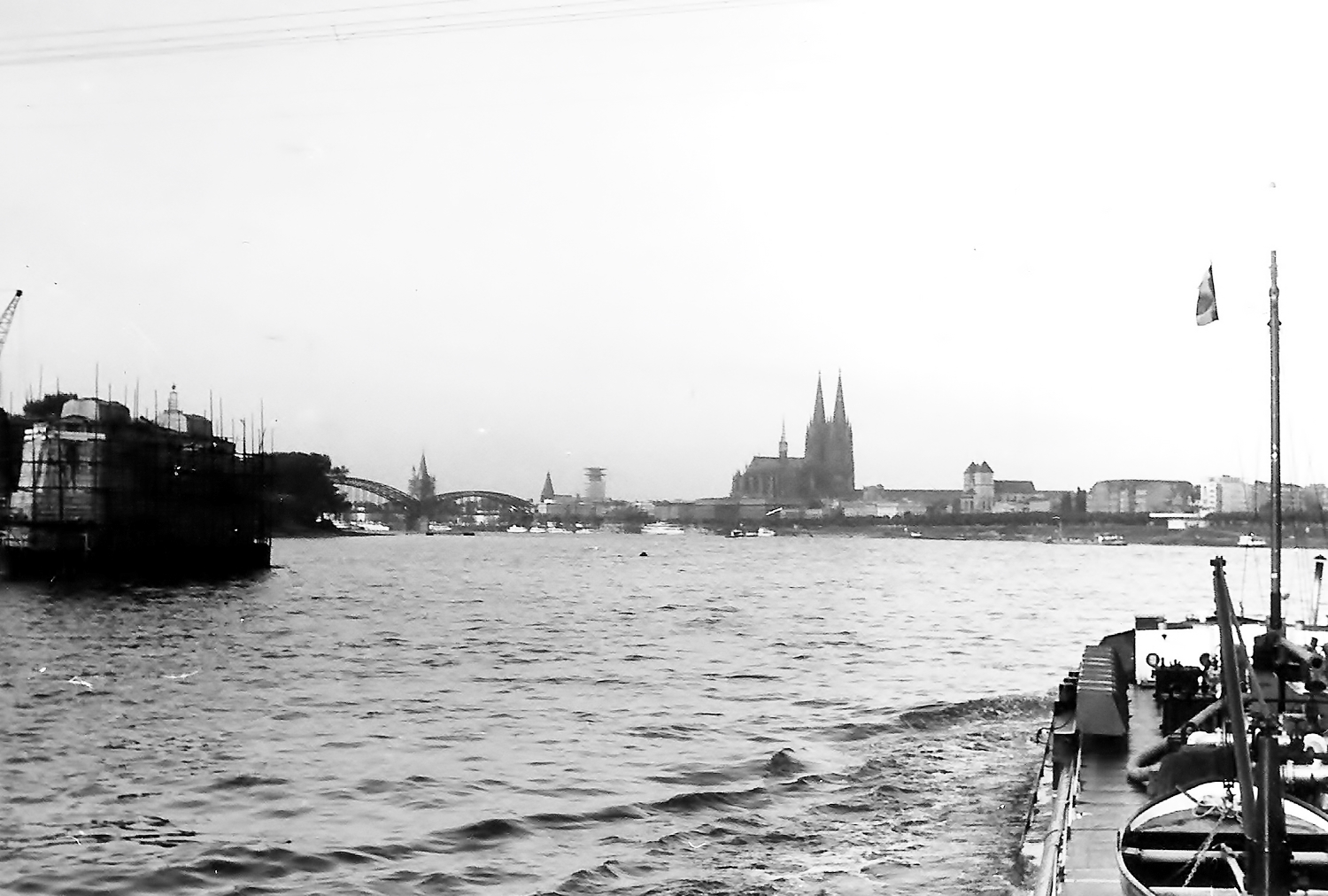 Alvracht 16 vaart weer verkeerde wal bij de in Keulen in aanbouw zijnde Zoobrücke die 3 jaar later klaar was.